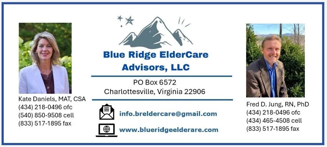 Founded by Fred Jung, RN, PhD. in 2020, the Blue Ridge Eldercare Practice expanded its professional services by welcoming a new Partner, Kate Daniels, MAT, CSA. Together, Fred and Kate bring a wealth of knowledge and experience helping older adults and their loved ones to attain and maintain optimum health, safety and well-being. We do this by referring you to the right resources, at the right times, as you and your loved ones continue your journey through life. To successfully help you achieve your care management needs, we offer the following services: